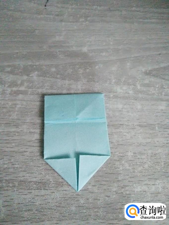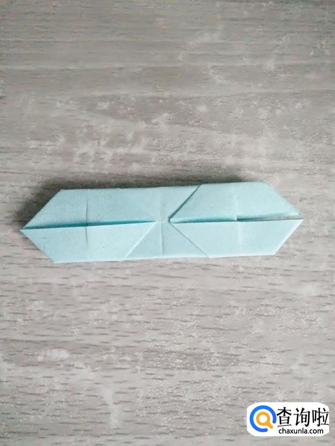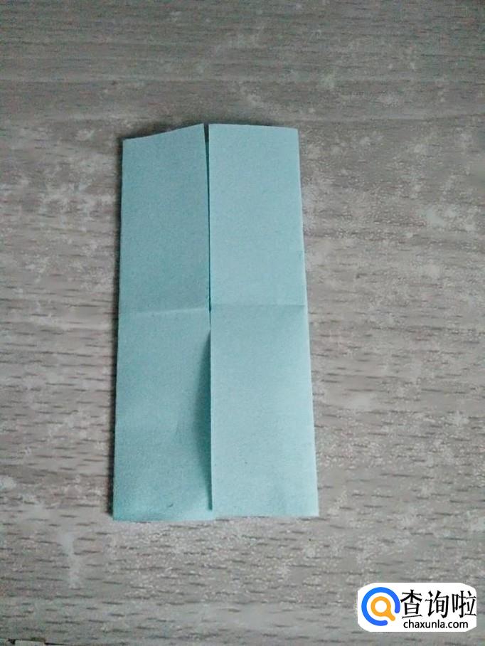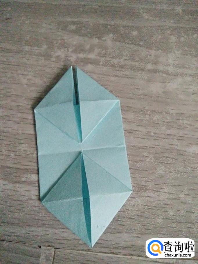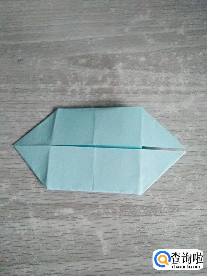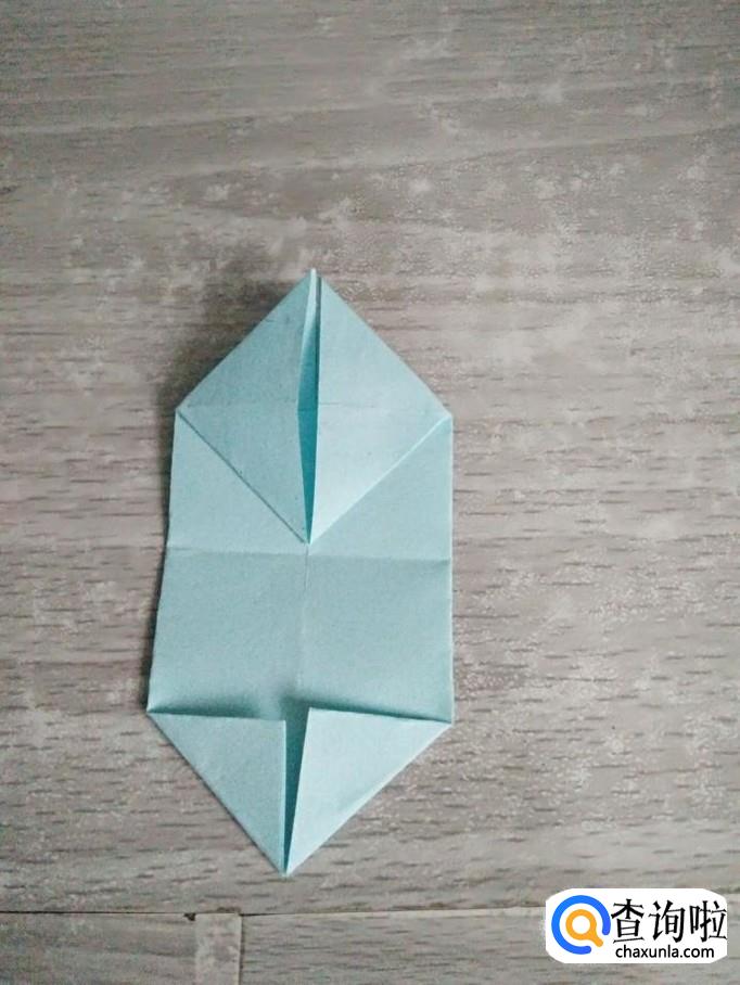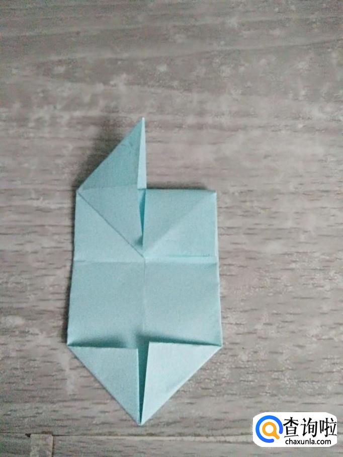 然后选择一边打开,接着沿中线对折,然后分别打开两个小正方形呈三角形,另一边按照此步骤折成一样,如图