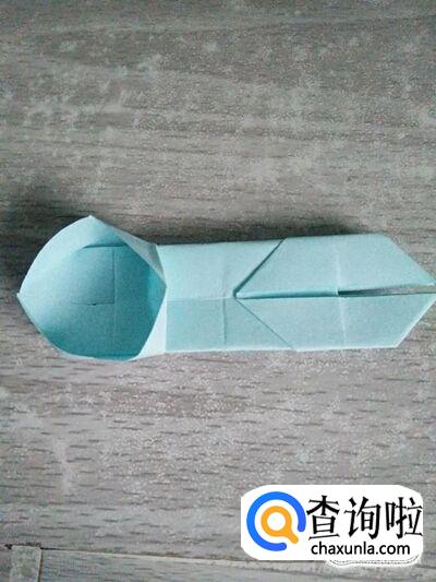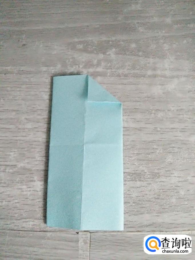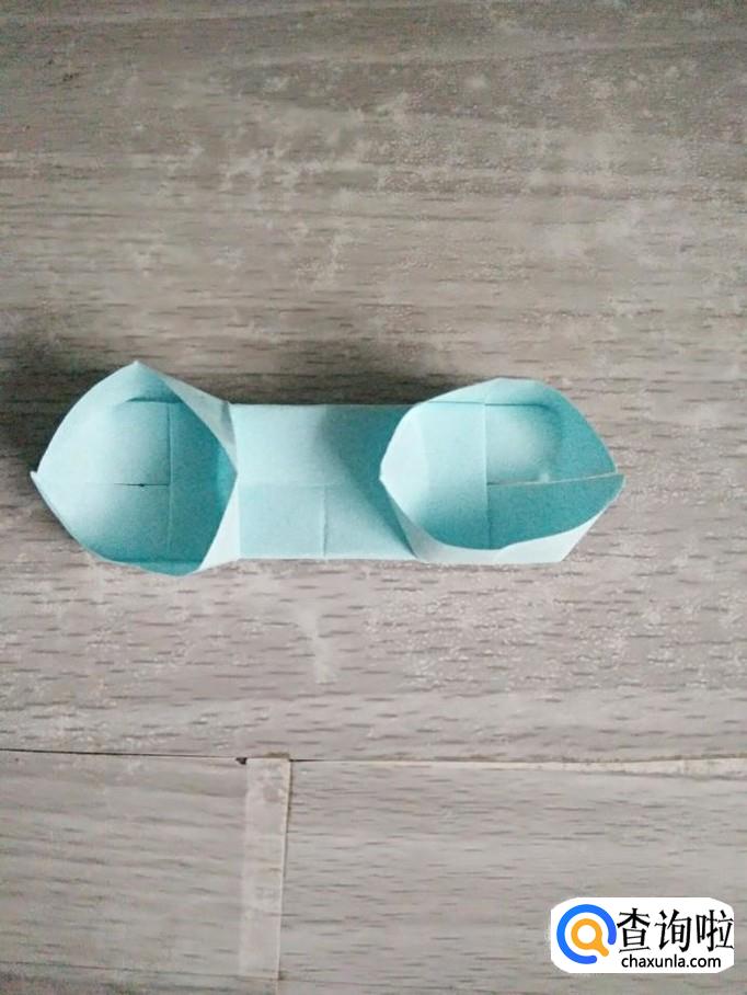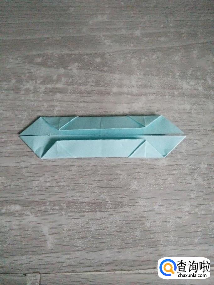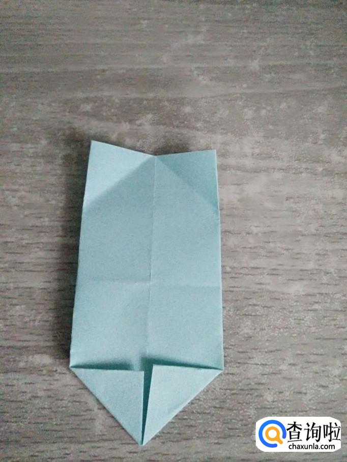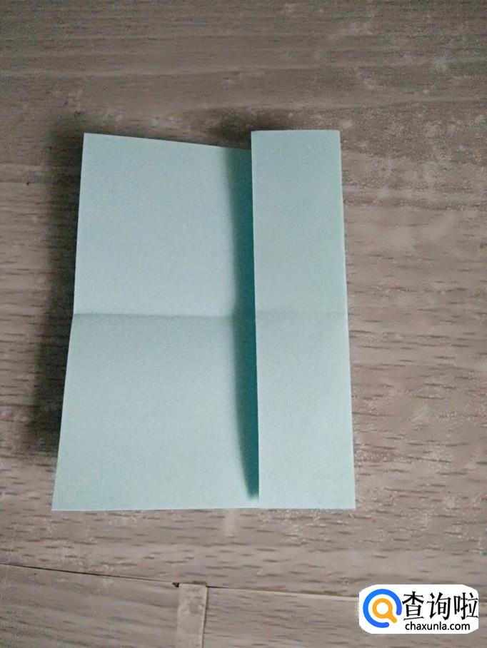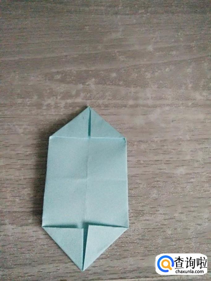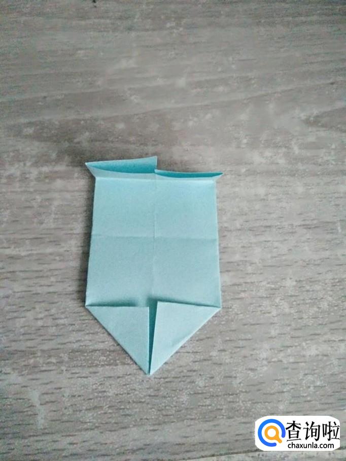 然后选择一边打开,接着沿中线对折,然后分别打开两个小正方形呈三角形,另一边按照此步骤折成一样,如图