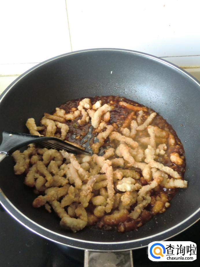 起锅烧油,油温七成熟的时候把裹好干淀粉的肉条放进去炸,肉条炸至金黄的时候捞出备用。