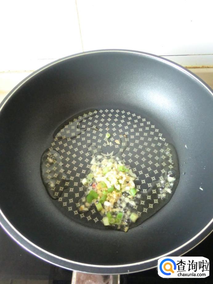 在锅里倒少许油,放入葱姜蒜爆香,然后把调好的酱汁倒入锅中,如下图。