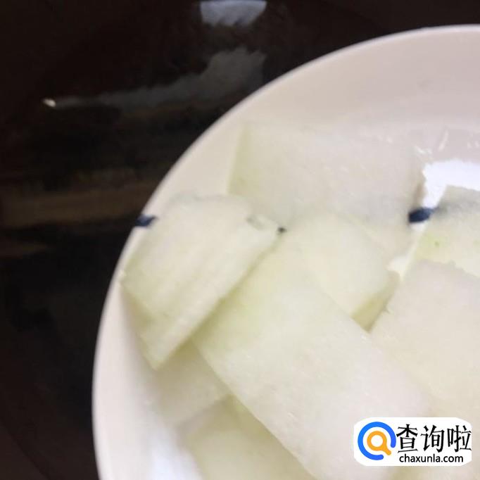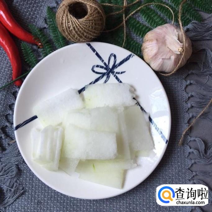 然后把冬瓜去皮,切成薄片,如下图所示。
