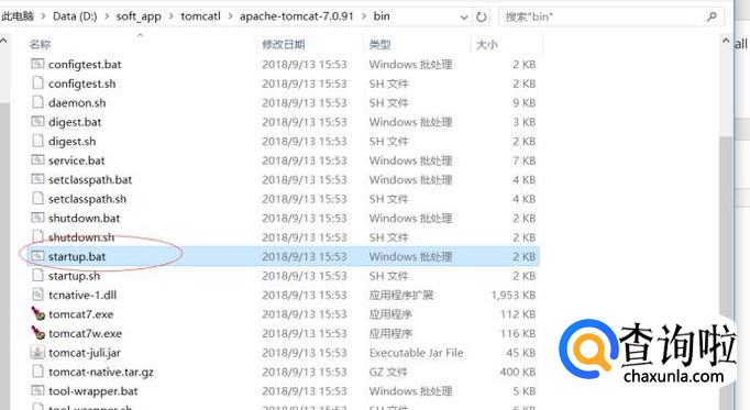 按照如下图所示的路径依次打开,找到bin下的startup.bat,双击运行