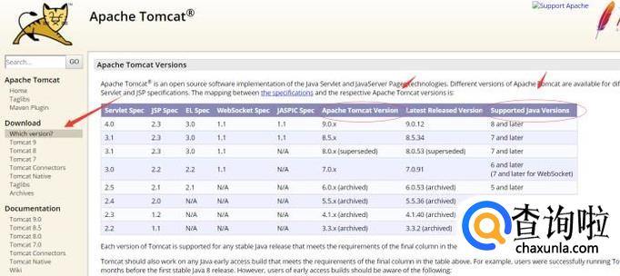 在tomcat首页左侧找到which version,查看Java和tomcat的版本对应信息
