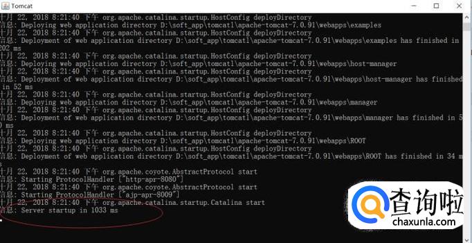 等待片刻,出现如下图所示的启动成功信息后,浏览器地址输入http://localhost:8080/,出现标志性的小猫就证明服务已正常启动,到此我们就完成了tomcat的安装使用了