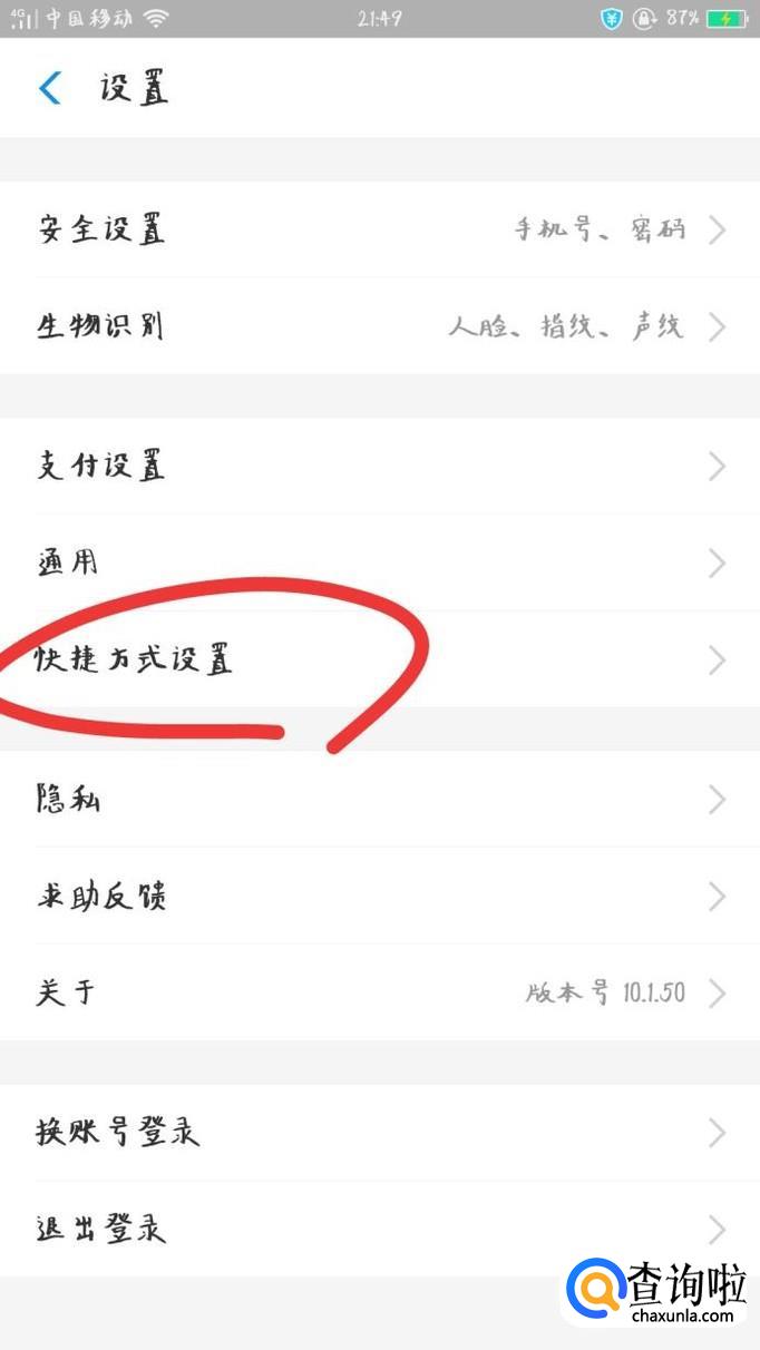 在设置界面里找到“快捷方式设置”,点击选择此选项。