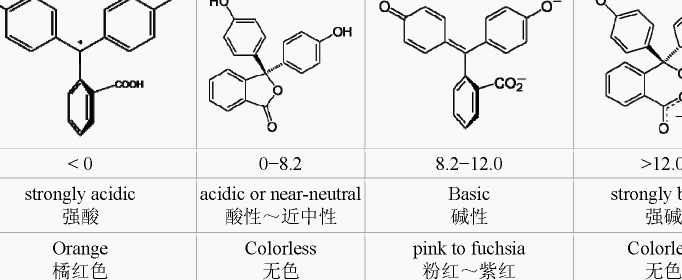 酚酞在酸性和中性溶液中为无色,在碱性溶液中为紫红色,极强酸性溶液中为橙色,极强碱性溶液中无色。