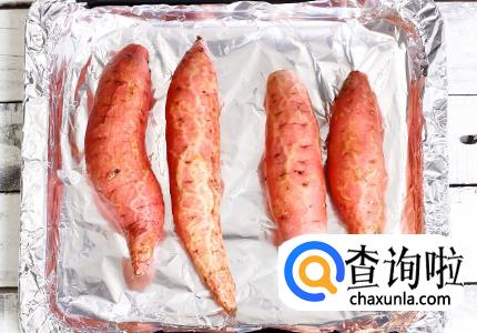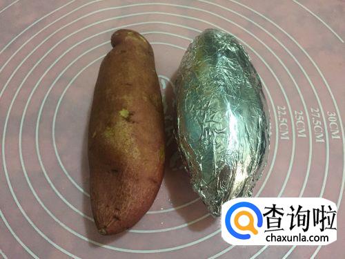 如果有锡纸的话,就用锡纸铺在烤盘上或者包裹红薯,防止烤的时候有汁溢出。