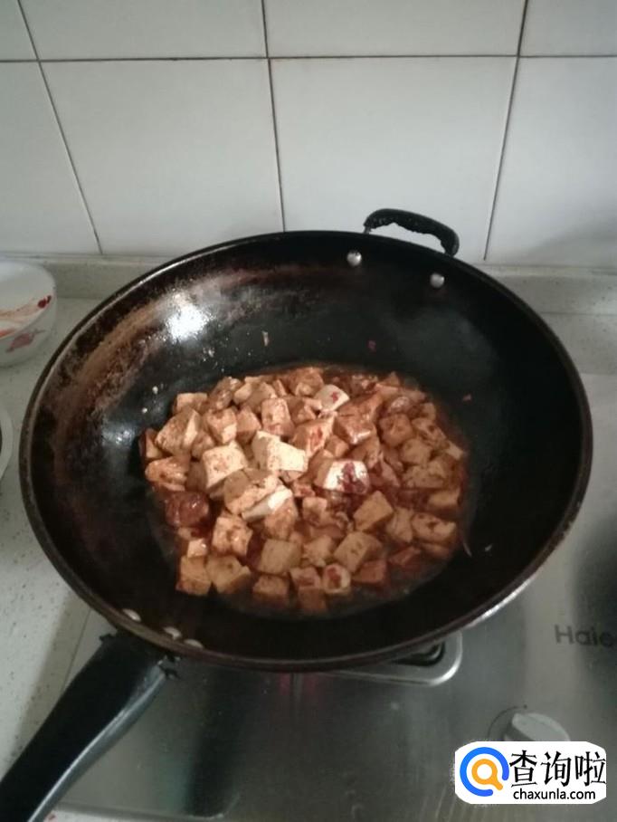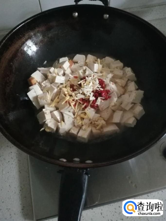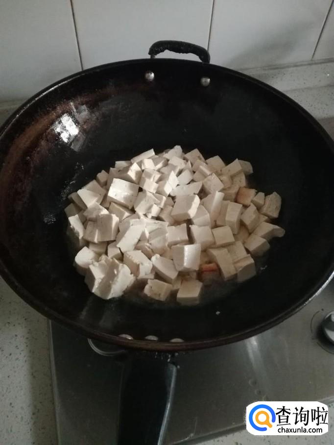 然后将切好的豆腐倒入锅里,烧大火将豆腐翻炒大概翻炒两到三分钟,直到豆腐微微变色。