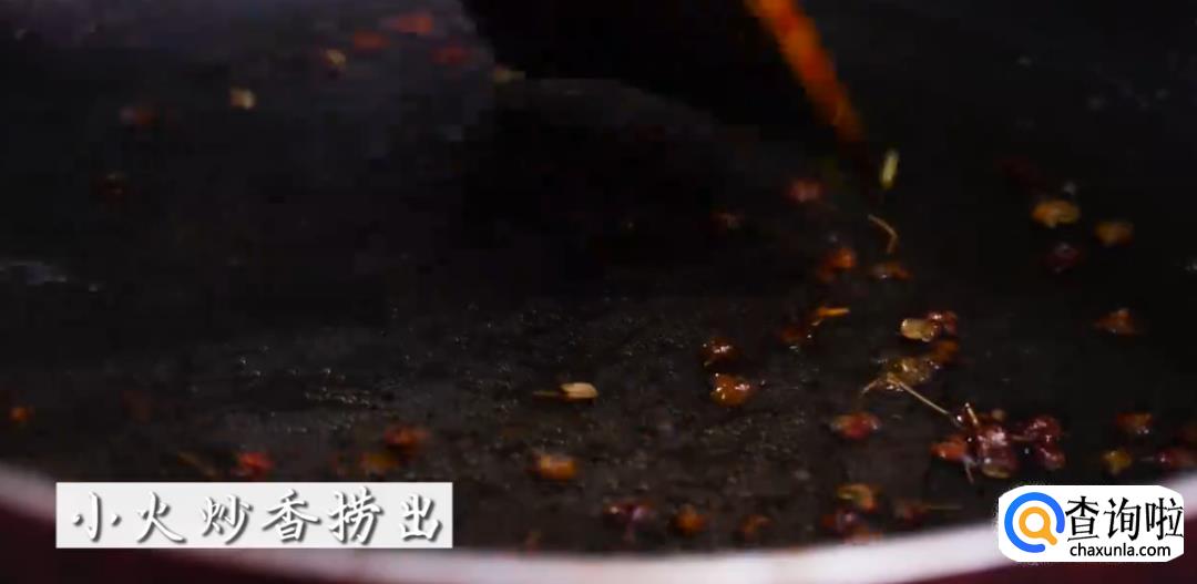 接下来,将锅烧热,倒入油,待油烧热后加入花椒,小火炒香后捞出来。