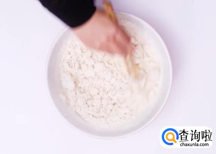 将准备好的面粉装在一个单独的碗里,然后用开水将面粉烫成面絮状。