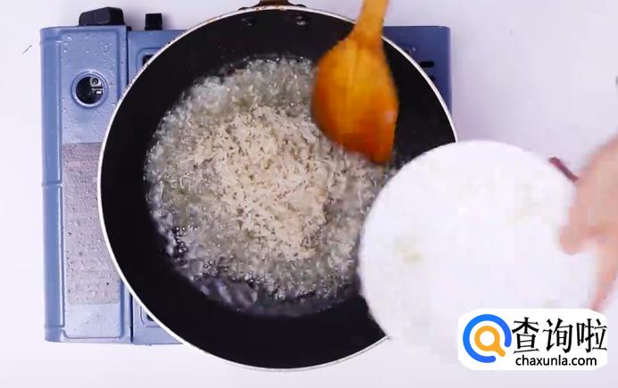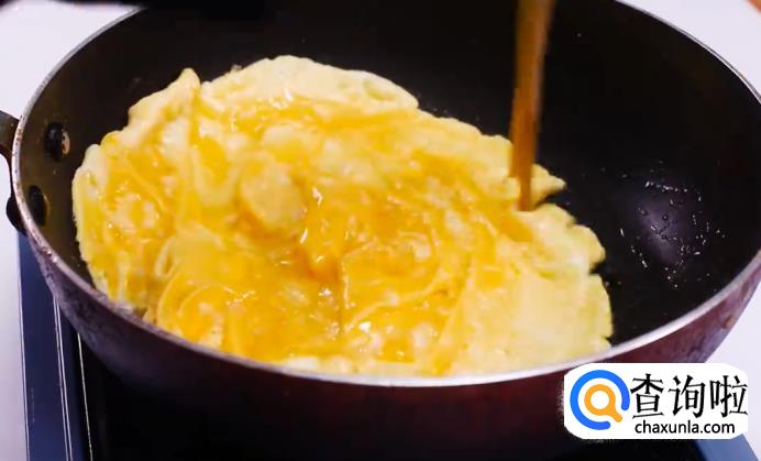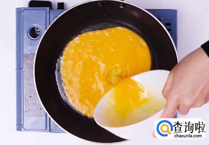 将锅烧热,倒入油,待油烧开后倒入蛋液,等蛋液变成蛋饼后捞出。