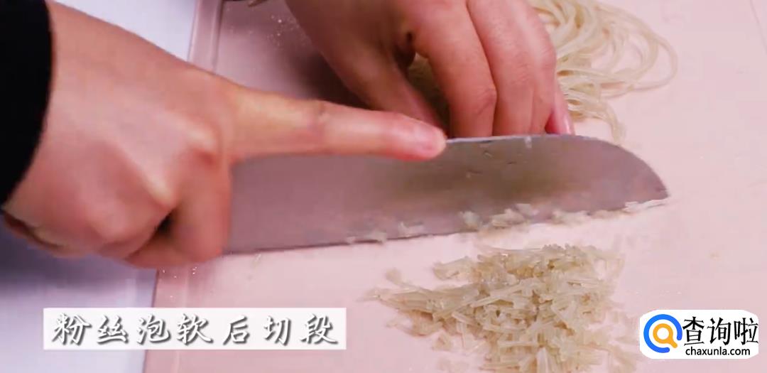首先,把粉丝泡软,然后切成小段。