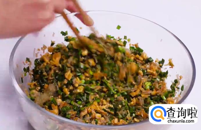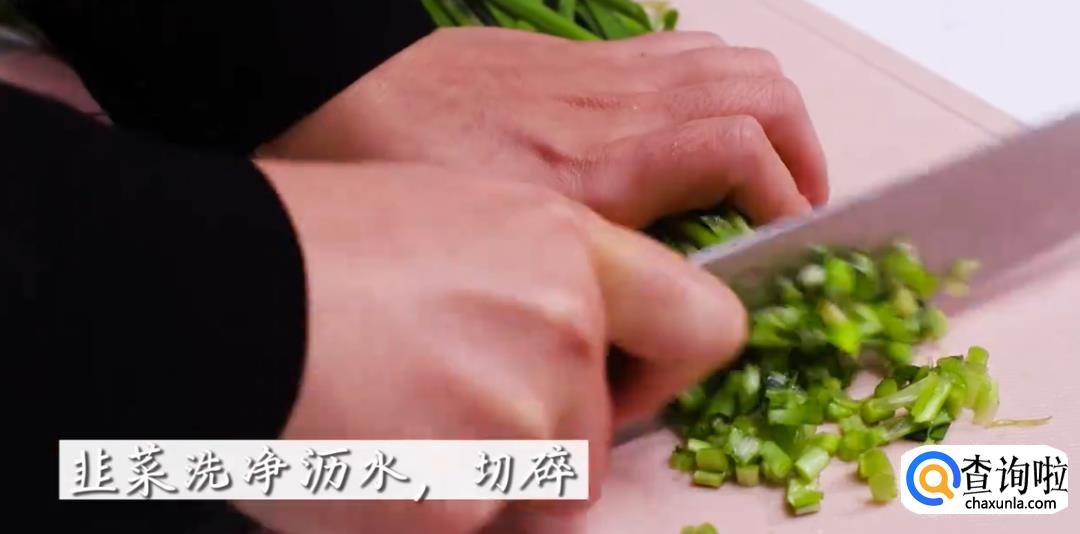 接着,把准备好的韭菜洗干净沥水,切成碎。