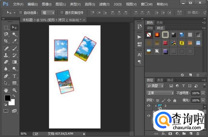 接下来我们只需要复制矩形和剪切的图片。然后移动位置并使用快捷键CTRL加t自由变换图形的形状,接着把图形中的图片换成其他的图片。这样我们很容易就制作好了照片的拼贴。