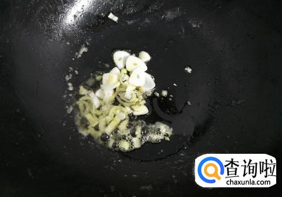 锅内放入少许油,油温6成热时放入葱花和蒜片爆锅。