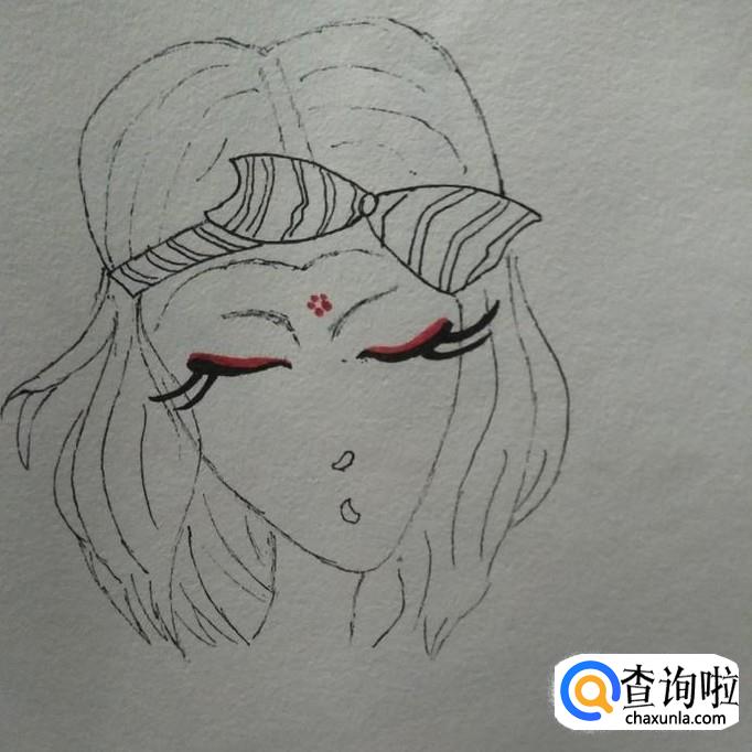 在蝴蝶结下方,靠近脸部边缘处,按如下图所示的笔法,画出紧闭的双眼,并且用签字笔将其涂的浓一些