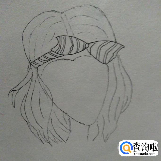 然后,我们以蝴蝶结的左右边界为界,画出蝴蝶结上方的头发,到此,一个御姐的头顶就画好了