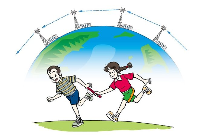 科学家们想到了“接力赛跑”的办法。参加过运动会的同学都很熟悉接力赛跑吧。在竞争激烈的接力赛跑中,小小接力棒在运动员手中传递着,每个人以最快的速度,跑完各自的路程,接力棒被用最快的速度传到终点。为了将信号传送到远方,微波通信也采用了接力赛跑的方式。人们每隔四五十千米,就建立一个微波中继站;一连串的“微波中继站”,就像古代的烽火台一样,每个中继站都有高耸的天线,把上一个中继站的信号接收下来,加以放大,再传送给下一个中继站。就这样,一站接一站地传送下去,实现了远距离的通信。