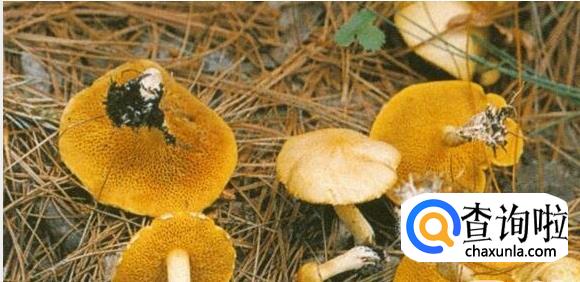 臭黄菇。臭黄菇又称鸡屎菌,子实体中等大。菌盖土黄至浅黄褐色,表面粘至粘滑,边缘有小疣组成的明显的粗条棱。也是一种毒蘑菇,毒素潜伏期短,发病快。一般可于食后半小时左右即发病,主要为胃肠道症状,如剧烈恶心、呕吐、腹痛、腹泻等。有的还出现精神错乱,头晕眼花,乱说乱唱,严重者则有面部抽搐,牙关紧闭,视力减弱,昏睡等。一般病程较短,如经及时治疗,可很快痊愈。