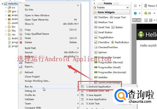 然后如果要运行项目的时候我们直接右键单击项目名称,然后选择Run As下面的Android Application选项,如下图所示