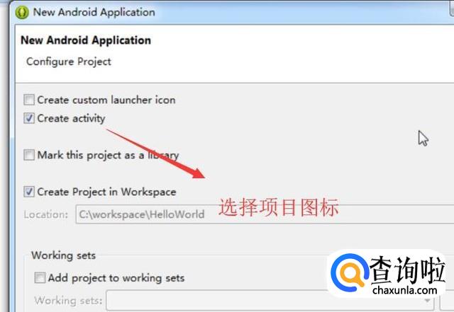 然后会进入到选择项目图标的界面,这里注意勾选Create activity复选框,如下图所示