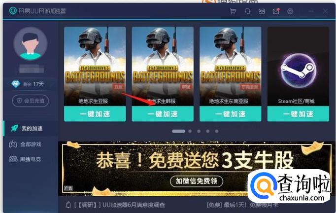 打开后的界面如图所示,可以看到在2网易uu加速器中有“绝地求生韩服”,并且下方有“我要加速”,点击“我要加速”