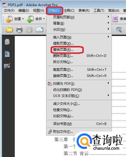 然后用该软件打开需要替换页面的PDF文档(名称为PDF1),如图所示,点击“文档”,在下拉菜单中选择“替换页面”。