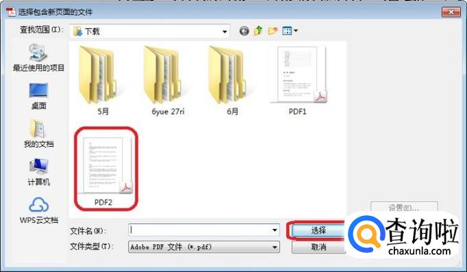 会弹出“选择包含新页面的文件”选项框,我们选择“PDF2”,点击“选择”。