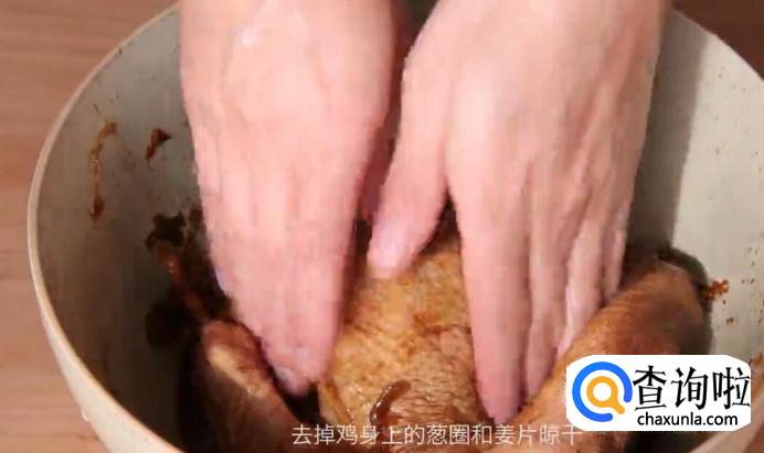 第二天,去掉鸡身上的葱圈和姜片晾干。