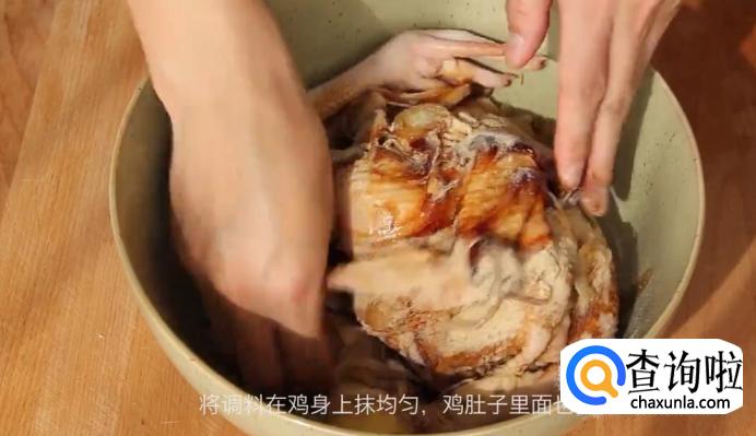 将调料在鸡身上涂抹均匀,鸡肚子里面也要抹到。