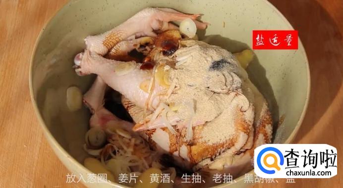 腌制鸡:鸡1000克、大葱40克、生姜20克、黄酒40克、生抽20克、老抽20克、蚝油20克、黑胡椒粉3克、盐适量