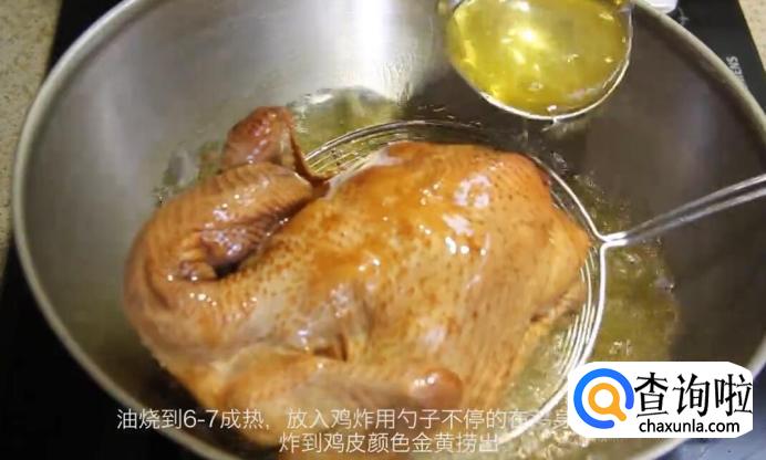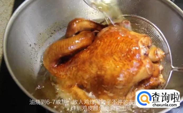 在锅内倒入油,油烧到6-7成热后,放入鸡炸,用勺子不停的鸡身上浇热油,炸到鸡皮颜色金黄捞出。