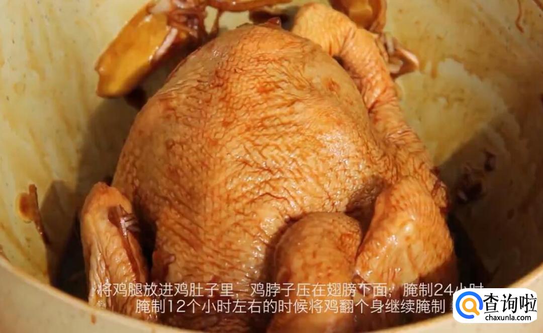 将鸡腿放进鸡肚子里,鸡脖子压在翅膀下面,腌制24小时,腌制12个小时左右的时候,将鸡翻个身继续腌制。