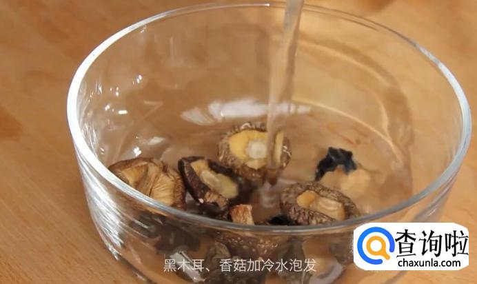 将黑木耳、香菇用冷水泡发。