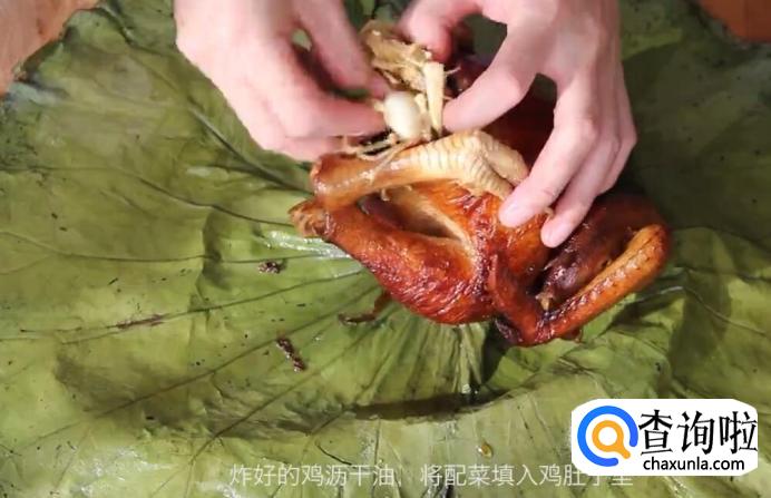 炸好的鸡沥干油,将配菜填入鸡肚子里。