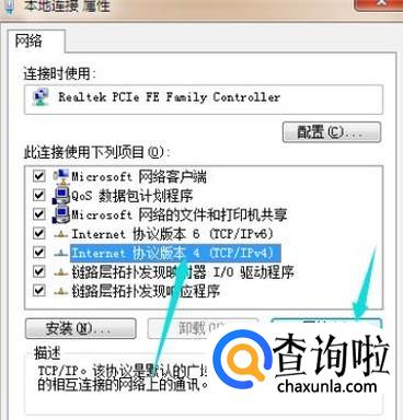 回到属性界面,点击Internet协议版本4,然后点击“属性”,如图。