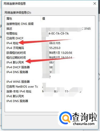 记下Ipv4地址,默认网关,和备用服务器地址,稍后会用到,如图所示。