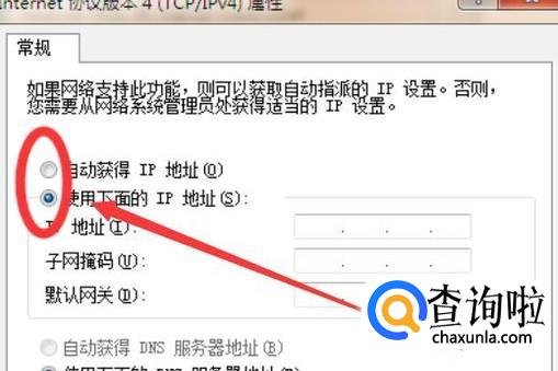 点击“使用下面的ip地址”,将刚刚记下的Ipv4地址,默认网关,和备用服务器地址填写上,点击“确定”即可。