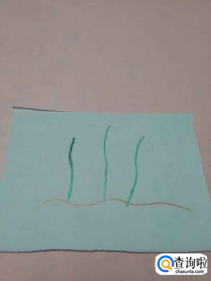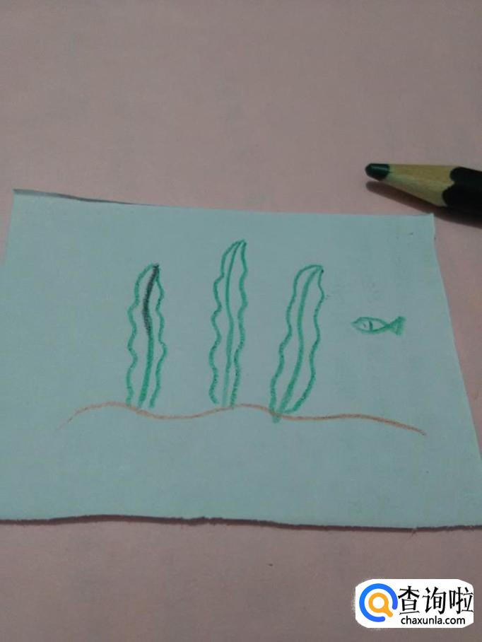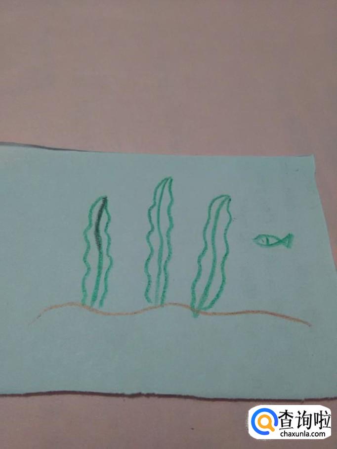 最后用绿笔在海草右边画两条交叉的弧线,表示小鱼,在小鱼的左侧画一条竖线,分出头和身体两部分。到这里,海草就画完了。