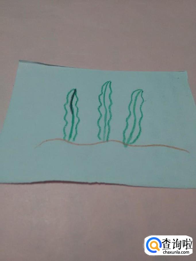 用绿色彩笔在沙子上面画三条竖着的波浪线,表示海草的叶脉。
