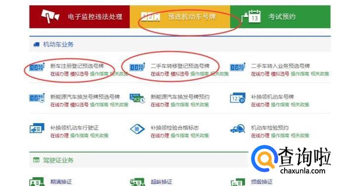 然后进入网站,页面下拉找到【预选机动车号码】,可以选择新车的登记号码或者二手车的登记号码,如下图所示: