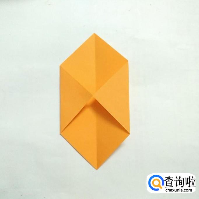 先把折纸沿对角线对折后打开,然后将两侧折向对角线。