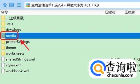 接着我们用鼠标双击该压缩包,然后从中找到名为xl的文件夹,然后再次双击这个文件夹,找到media子文件夹,如图所示...