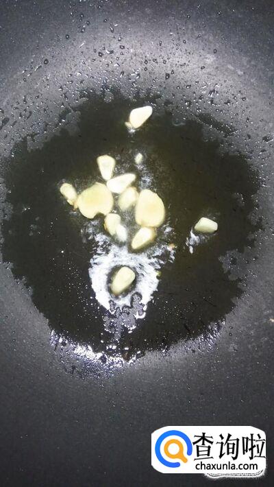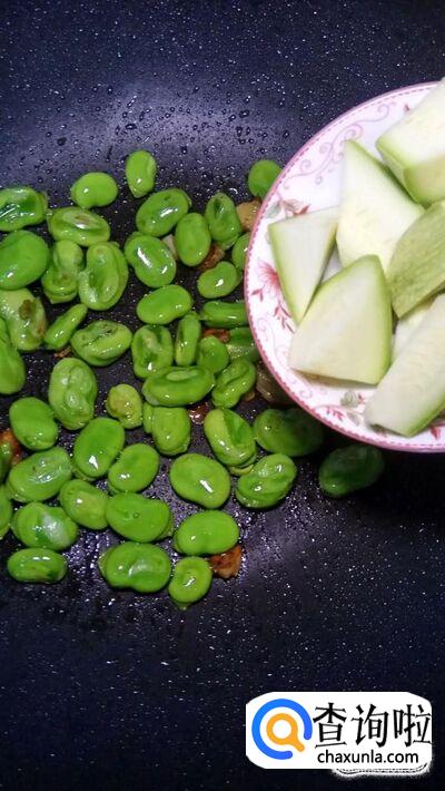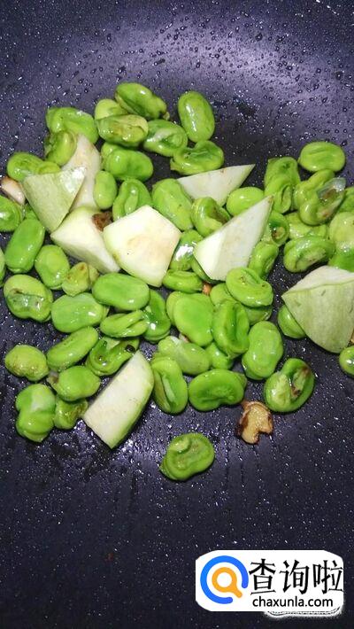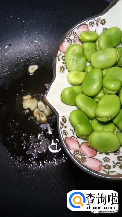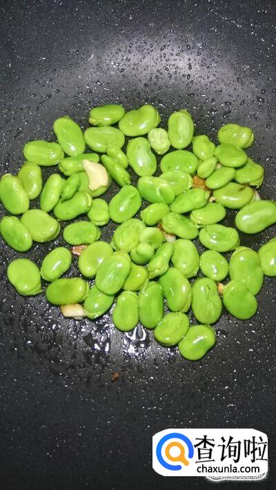 准备适量蒜,切成片儿,锅中放入适量油,油热后,放入蒜片爆香,将准备好的蚕豆倒入锅中,翻炒一会。翻炒至蚕豆表面起皱,就差不多了。