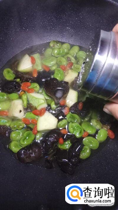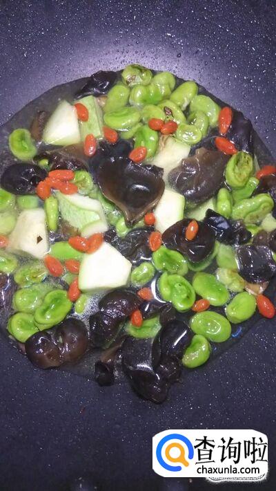 将新鲜的蚕豆去皮后,洗净,放入盘中备用,将木耳和枸杞子提前泡一下。注意,蚕豆最好买那种带皮的蚕豆,吃多少就剥多少,最新鲜了。