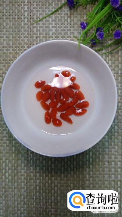 加入少许清水,然后再放入适量泡好的枸杞子。注意,水不要加太多。枸杞子点缀一下,既营养又好看。