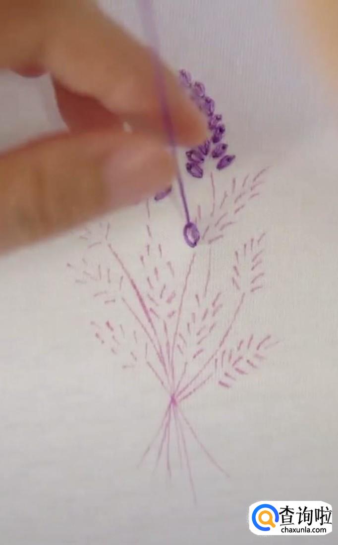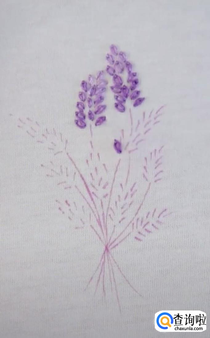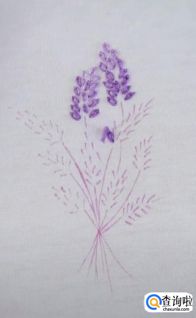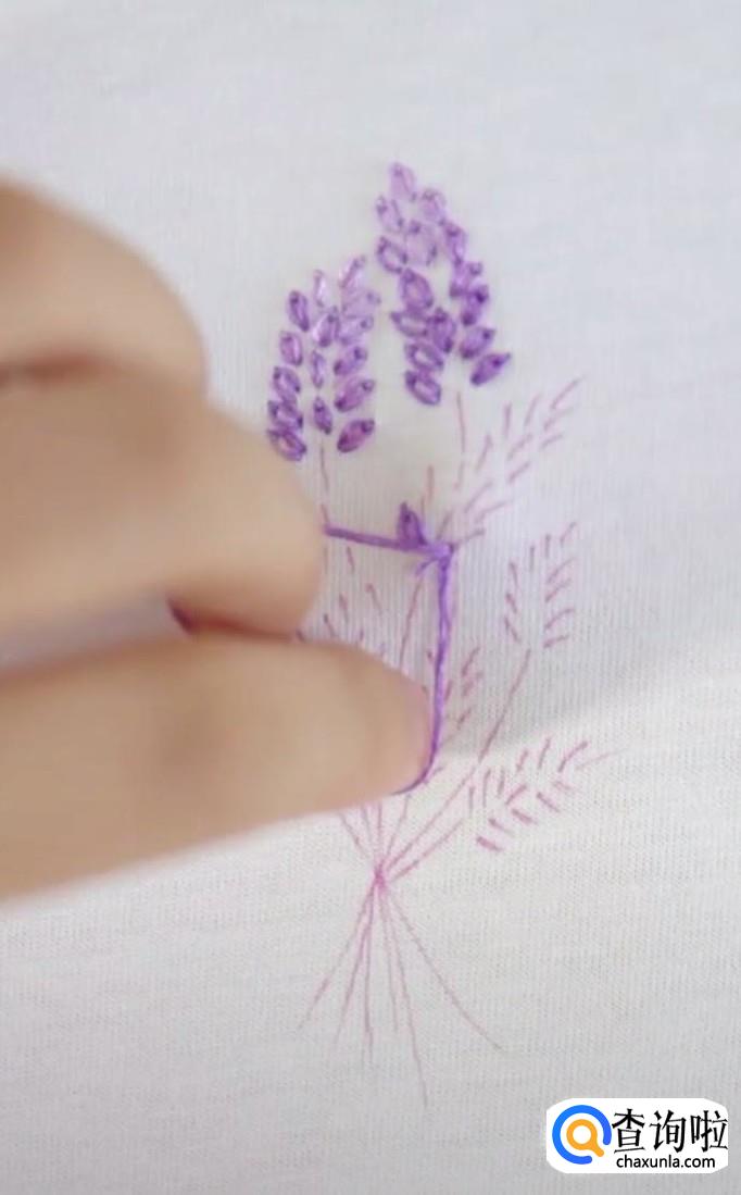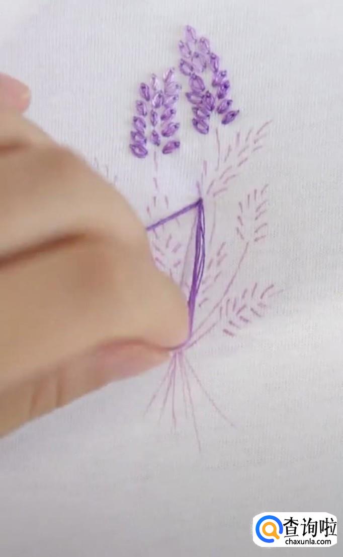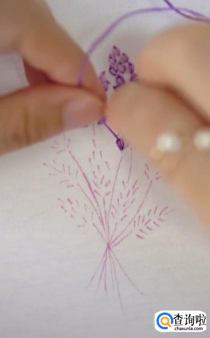 再绣第二个麦穗,同样的方法,先从麦穗的尾部开始,再到顶部固定。每一个麦穗都是这样绣,所有的麦穗都锈成紫色。注意绣麦穗时,底下的麦穗用深紫色的线,而尖部的麦穗用浅紫色线。这样秀出来的麦穗更有立体感,更加真实。