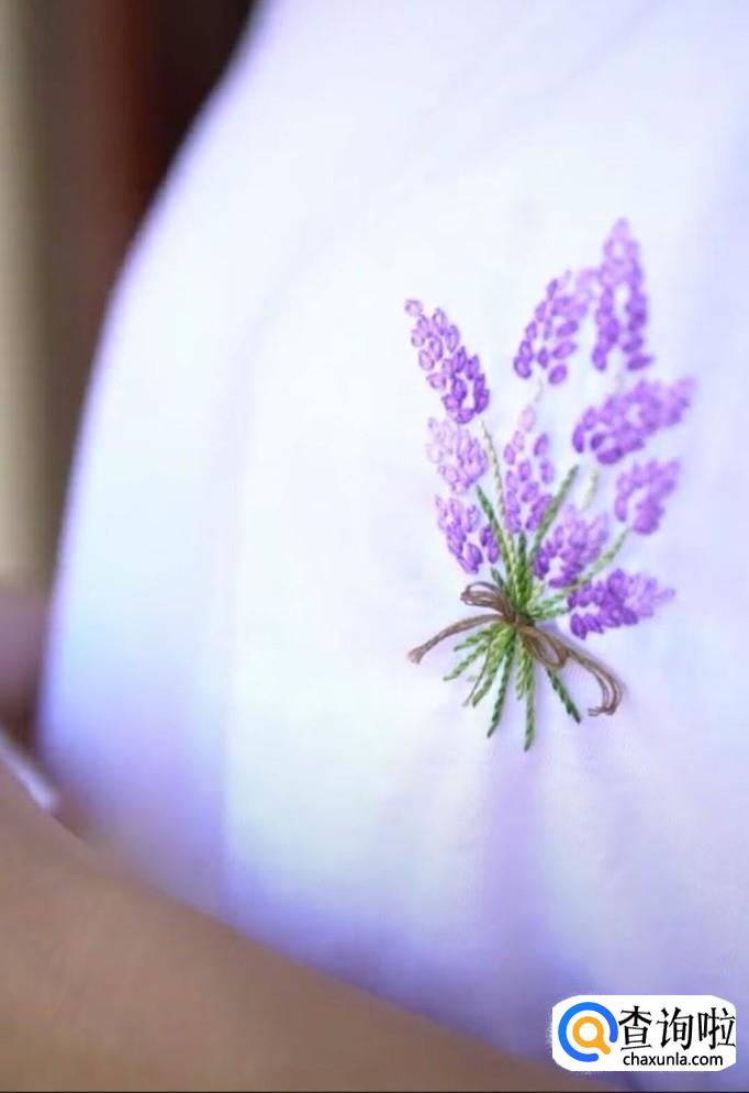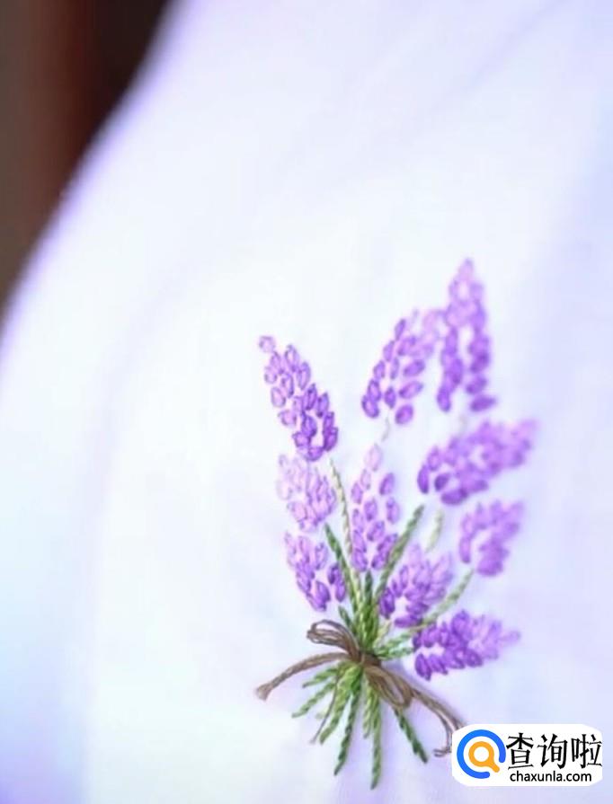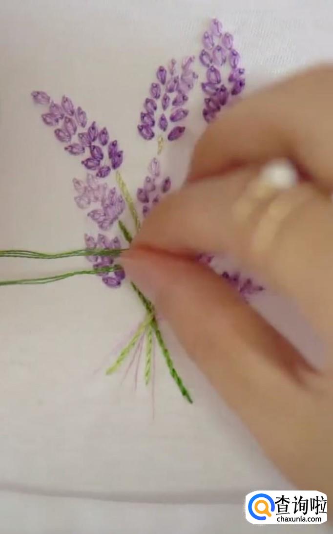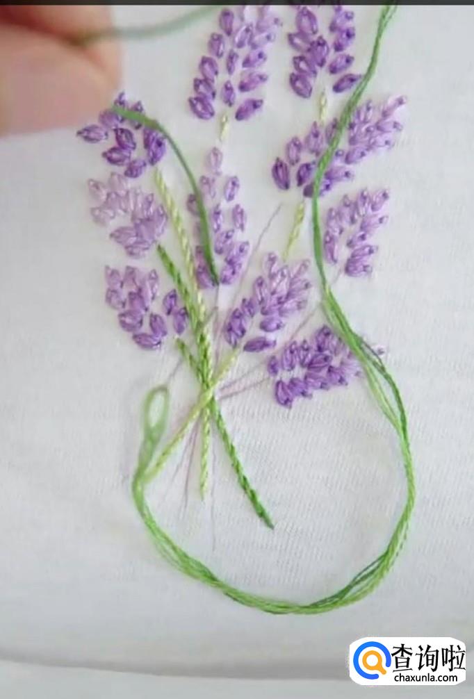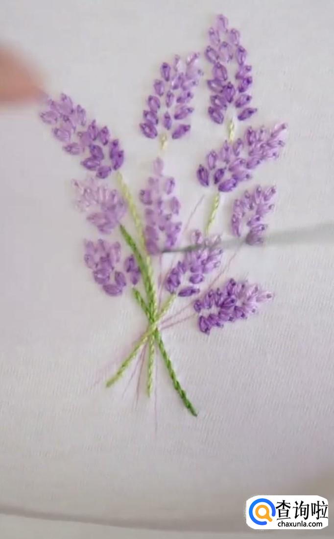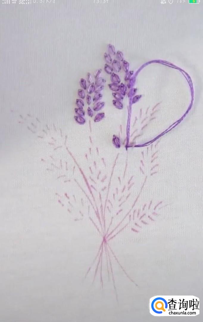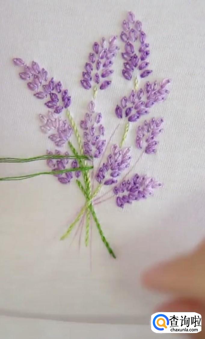 再绣第二个麦穗,同样的方法,先从麦穗的尾部开始,再到顶部固定。每一个麦穗都是这样绣,所有的麦穗都锈成紫色。注意绣麦穗时,底下的麦穗用深紫色的线,而尖部的麦穗用浅紫色线。这样秀出来的麦穗更有立体感,更加真实。