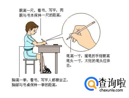一般右手执笔,笔的位置要略偏右侧。眼睛距纸面约30厘米,胸部距桌边约10厘米。两臂自然伸展,小臂平枕桌面。以拇指和食指的指肚分别按住笔杆的左右两侧,中指第一关节左侧抵住笔杆的下方,无名指和小指依次贴靠中指自然弯曲成半握拳状,起直辖市控制作用。拇指与笔杆接触点到笔尖的距离约4厘米。