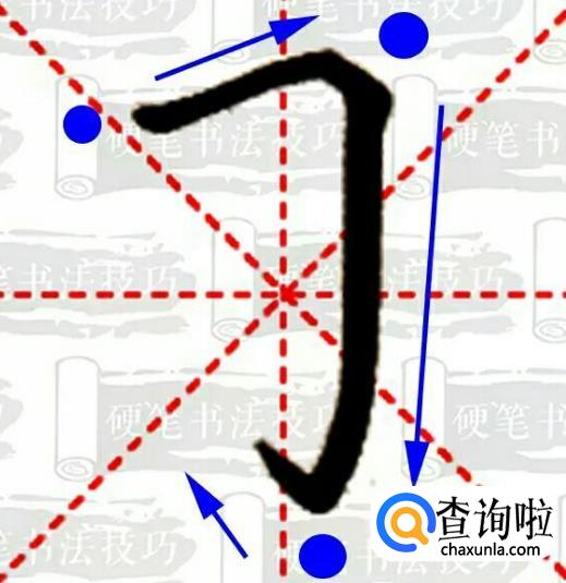 5.右点基本落在45度的虚线上,即平分了竖折和竖勾所形成的直角区域内。